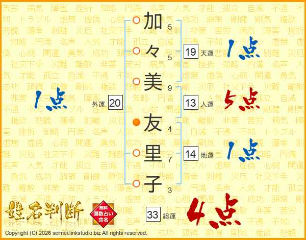 加(5画)々(5画)美(9画) 友(4画)里(7画)子(3画)