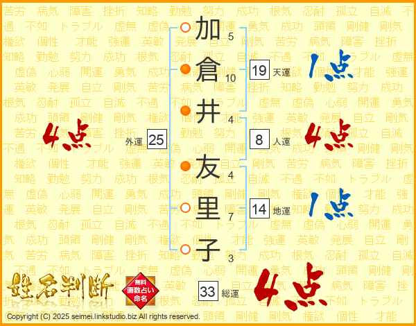 加(5画)倉(10画)井(4画) 友(4画)里(7画)子(3画)