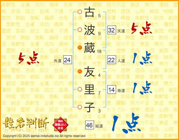 古(5画)波(9画)蔵(18画) 友(4画)里(7画)子(3画)