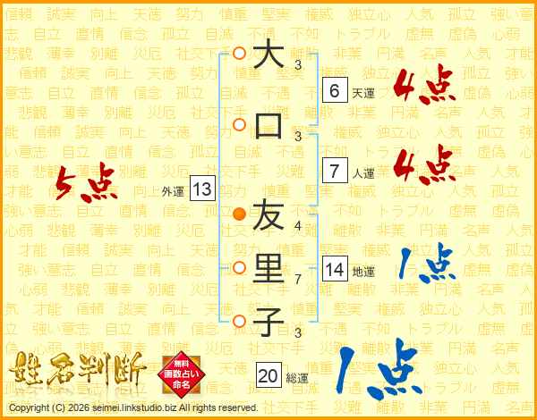 大(3画)口(3画) 友(4画)里(7画)子(3画)