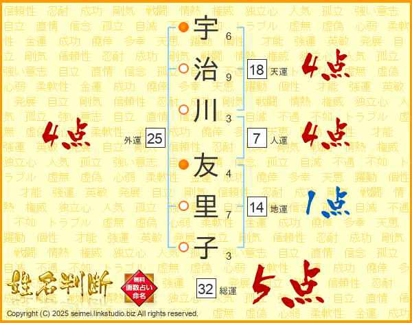 宇治川友里子さんの総運は32画の5点!