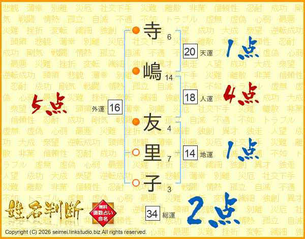 寺(6画)嶋(14画) 友(4画)里(7画)子(3画)