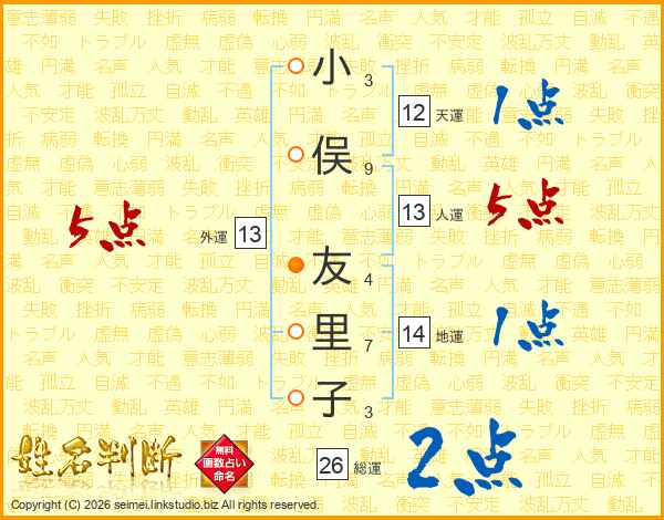 小(3画)俣(9画) 友(4画)里(7画)子(3画)