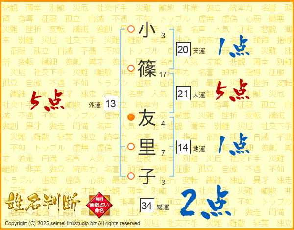 小(3画)篠(17画) 友(4画)里(7画)子(3画)