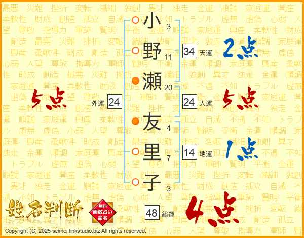 小(3画)野(11画)瀬(20画) 友(4画)里(7画)子(3画)