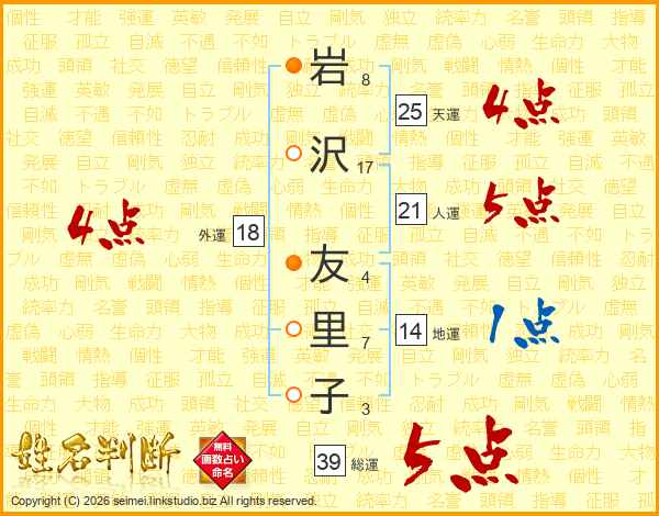岩(8画)沢(17画) 友(4画)里(7画)子(3画)