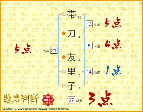 帯(11画)刀(2画) 友(4画)里(7画)子(3画)