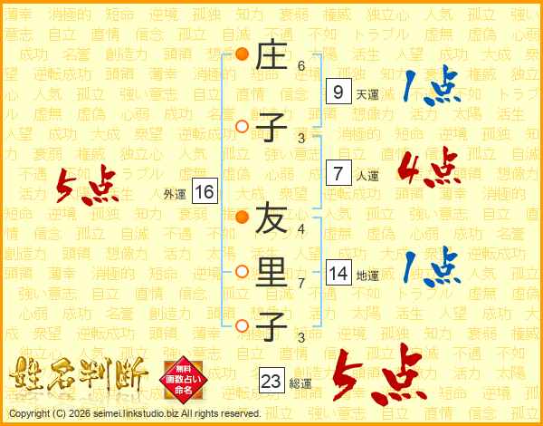 庄子友里子さんの総運は23画の5点!