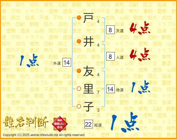 戸(4画)井(4画) 友(4画)里(7画)子(3画)