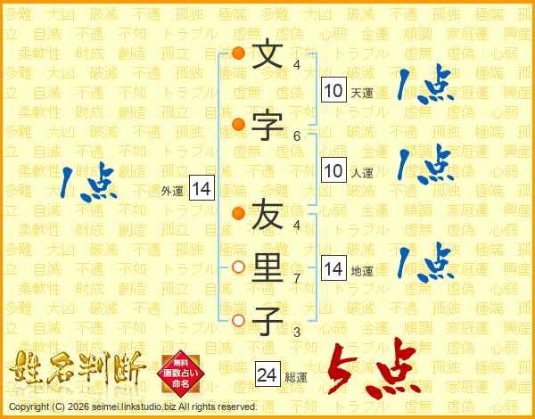 文(4画)字(6画) 友(4画)里(7画)子(3画)