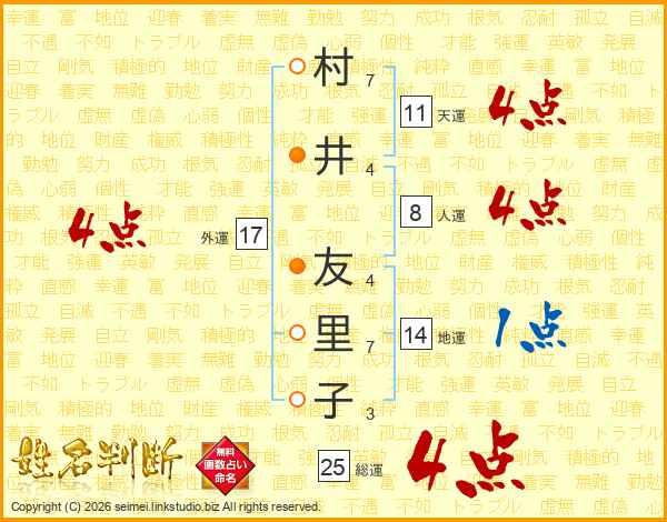 村(7画)井(4画) 友(4画)里(7画)子(3画)