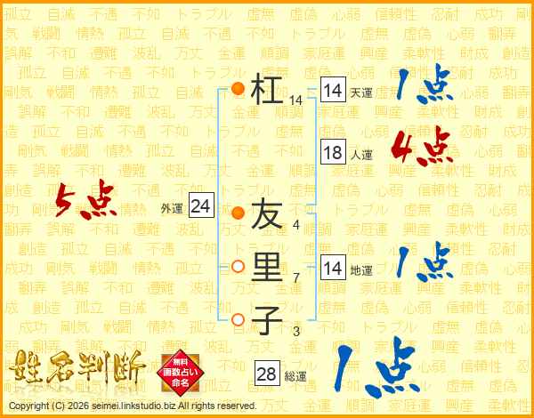 生活面を象徴する運勢です。外部から受ける影響力を表し、結婚運、家庭運や職場、環境への順応性を表します。総運から人運を引いた画数。姓や名が1文字の場合を除く。