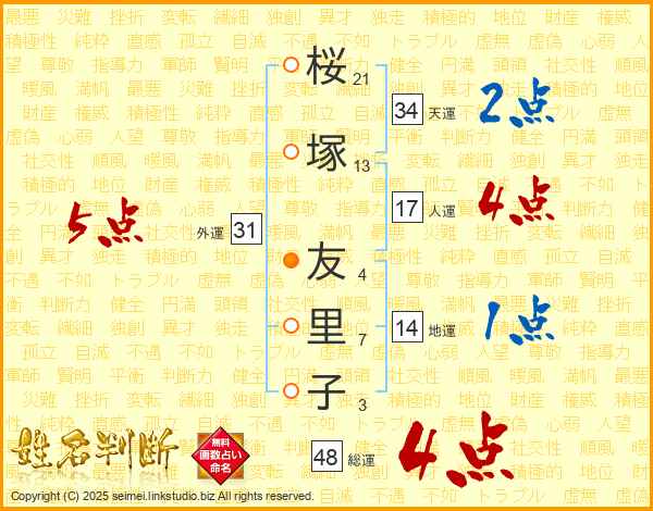 桜(21画)塚(13画) 友(4画)里(7画)子(3画)