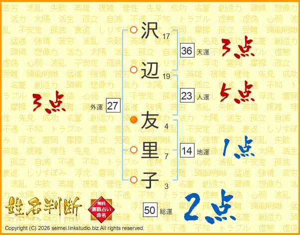 沢(17画)辺(19画) 友(4画)里(7画)子(3画)