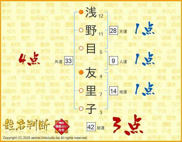 浅(12画)野(11画)目(5画) 友(4画)里(7画)子(3画)