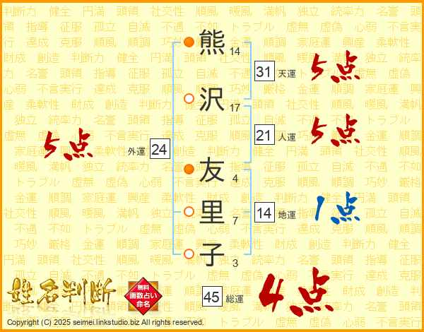 熊(14画)沢(17画) 友(4画)里(7画)子(3画)