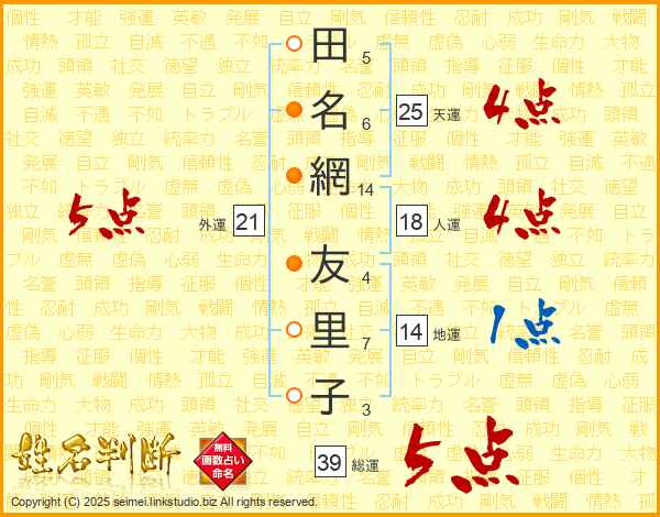 田(5画)名(6画)網(14画) 友(4画)里(7画)子(3画)