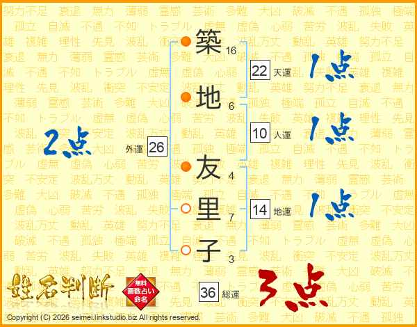 築(16画)地(6画) 友(4画)里(7画)子(3画)