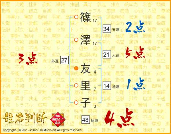 篠(17画)澤(17画) 友(4画)里(7画)子(3画)