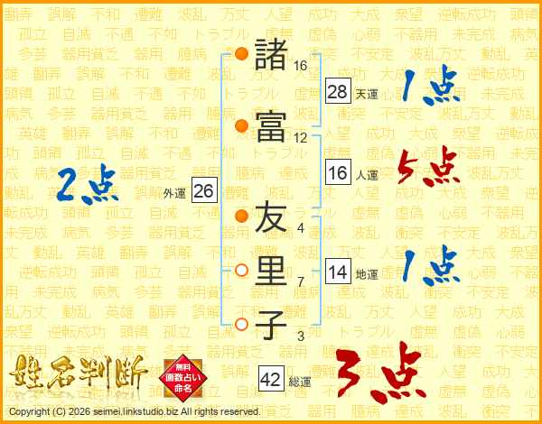 諸(16画)富(12画) 友(4画)里(7画)子(3画)