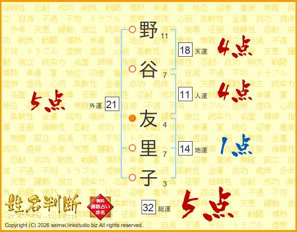 野(11画)谷(7画) 友(4画)里(7画)子(3画)