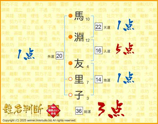 馬(10画)淵(12画) 友(4画)里(7画)子(3画)