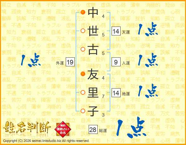 中(4画)世(5画)古(5画) 友(4画)里(7画)子(3画)