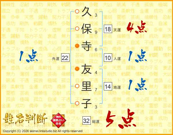 久(3画)保(9画)寺(6画) 友(4画)里(7画)子(3画)