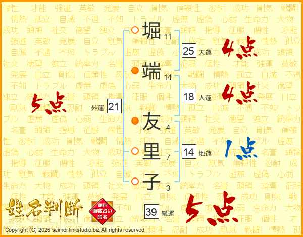堀(11画)端(14画) 友(4画)里(7画)子(3画)