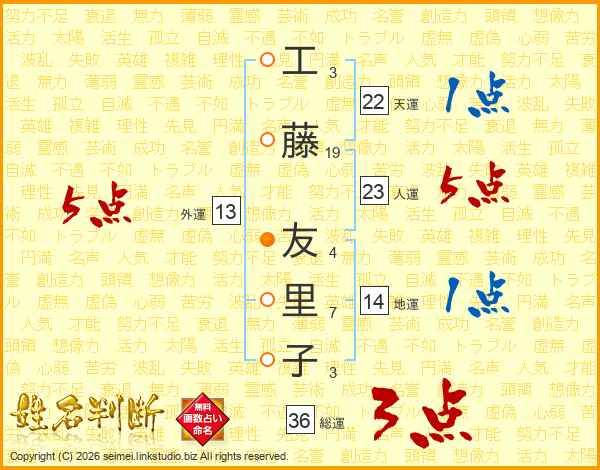 工(3画)藤(19画) 友(4画)里(7画)子(3画)
