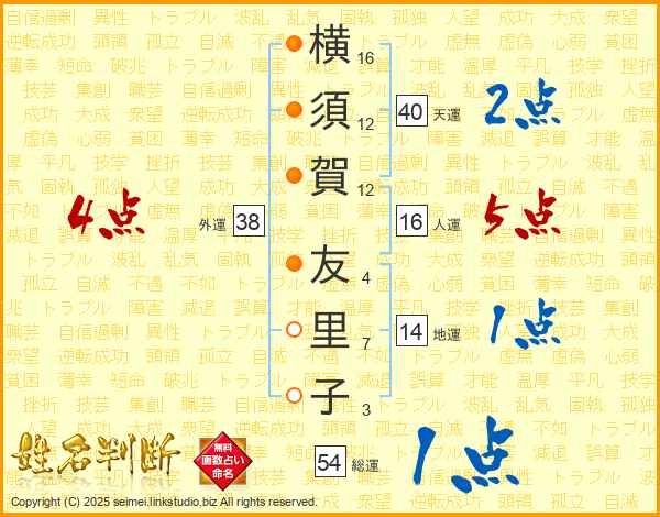 横(16画)須(12画)賀(12画) 友(4画)里(7画)子(3画)