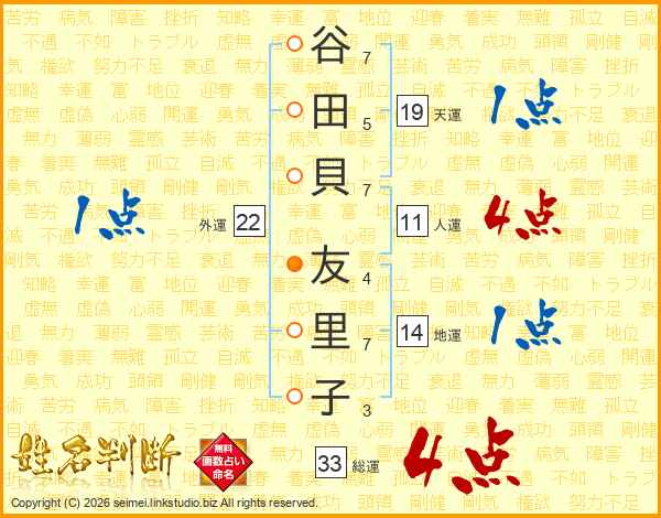 谷(7画)田(5画)貝(7画) 友(4画)里(7画)子(3画)