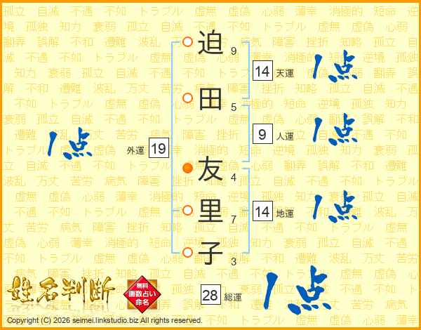 迫(9画)田(5画) 友(4画)里(7画)子(3画)