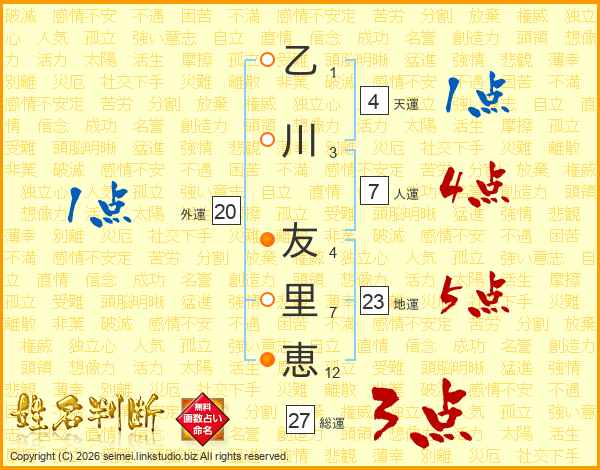 乙(1画)川(3画) 友(4画)里(7画)恵(12画)