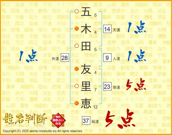 五(5画)木(4画)田(5画) 友(4画)里(7画)恵(12画)