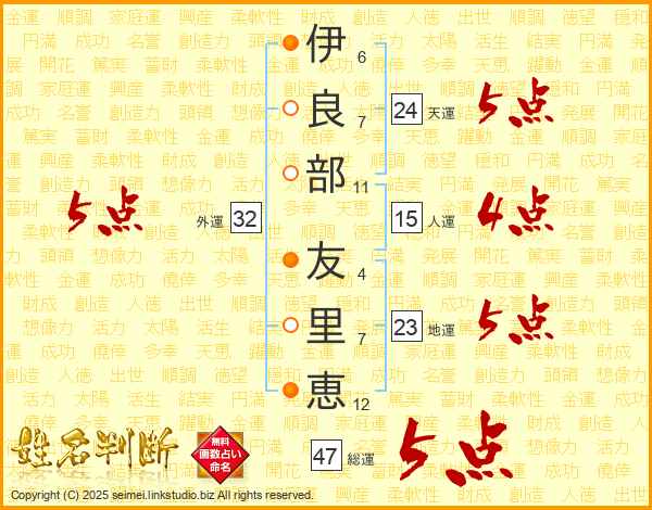伊(6画)良(7画)部(11画) 友(4画)里(7画)恵(12画)