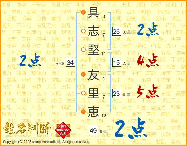 具(8画)志(7画)堅(11画)  友(4画)里(7画)恵(12画)