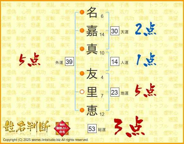 名(6画)嘉(14画)真(10画) 友(4画)里(7画)恵(12画)