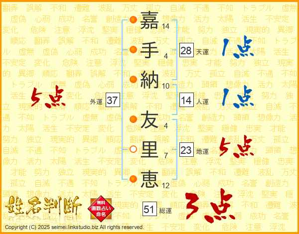 嘉(14画)手(4画)納(10画) 友(4画)里(7画)恵(12画)
