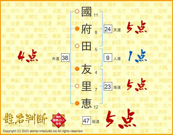 國(11画)府(8画)田(5画) 友(4画)里(7画)恵(12画)