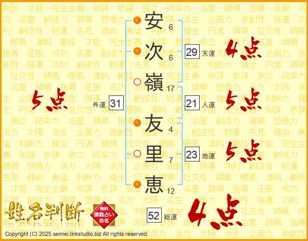安(6画)次(6画)嶺(17画) 友(4画)里(7画)恵(12画)