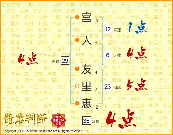宮(10画)入(2画) 友(4画)里(7画)恵(12画)