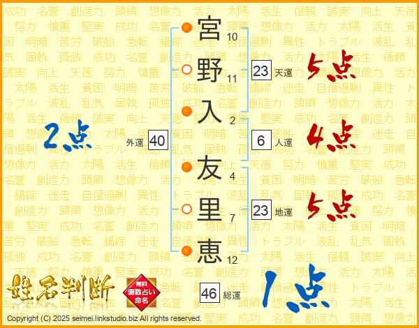 宮(10画)野(11画)入(2画) 友(4画)里(7画)恵(12画)