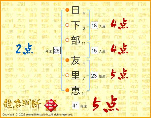 日(4画)下(3画)部(11画) 友(4画)里(7画)恵(12画)