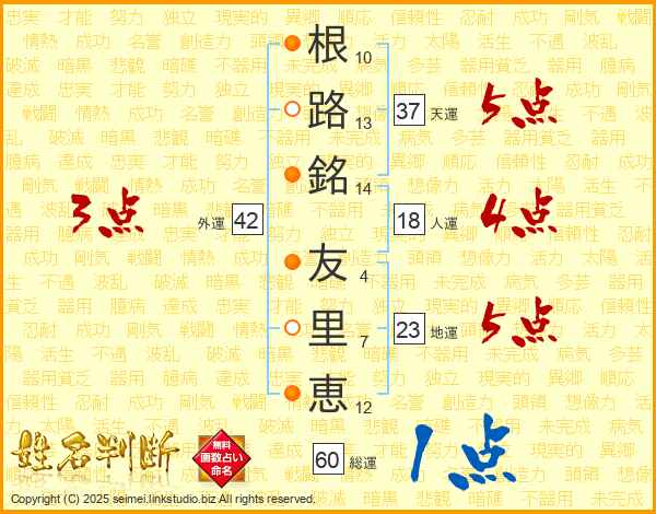 根(10画)路(13画)銘(14画)  友(4画)里(7画)恵(12画)