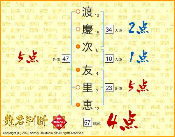 渡(13画)慶(15画)次(6画)  友(4画)里(7画)恵(12画)