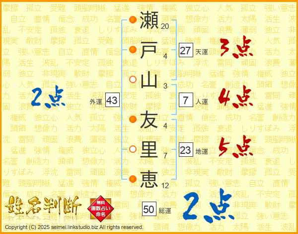 瀬(20画)戸(4画)山(3画) 友(4画)里(7画)恵(12画)