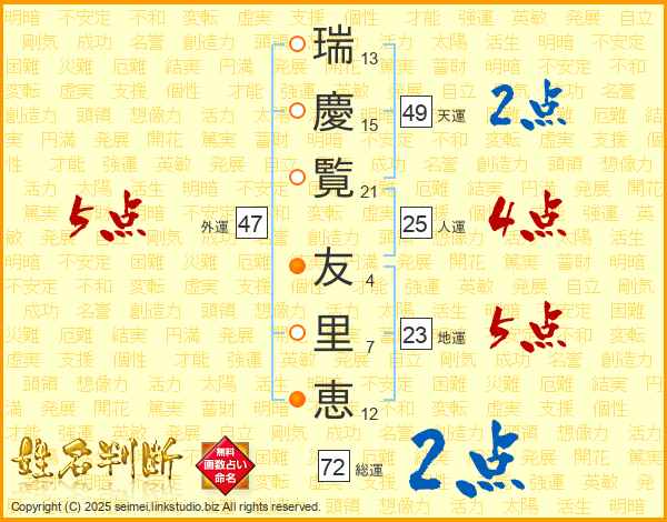 瑞(13画)慶(15画)覧(21画) 友(4画)里(7画)恵(12画)