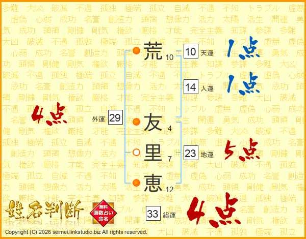 荒(10画) 友(4画)里(7画)恵(12画)