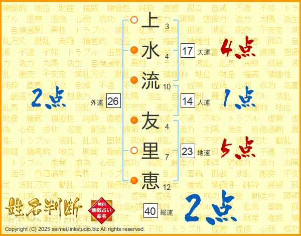 上(3画)水(4画)流(10画) 友(4画)里(7画)恵(12画)
